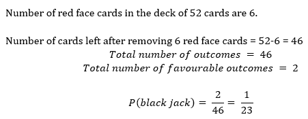 If all the red face cards are removed from the deck of 52 playing cards, then the probability of getting a black jack from the remaining cards is: